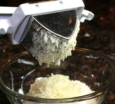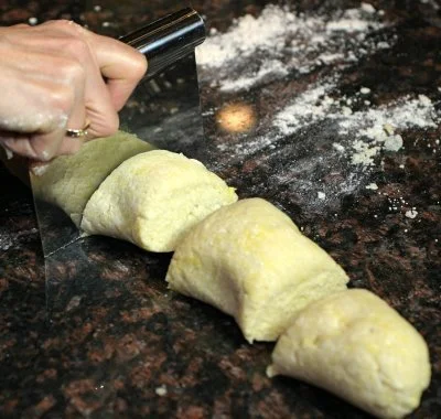 There are two pieces of equipment that you really should have to make gnocchi. One is a potato ricer. The consistency of the potato is important and you can really only get it with a ricer. The other piece of equipment is a pastry scraper. It will make it a whole lot easier to use a pastry scraper because it is ideal for cutting the gnocchi and then you have to lift the gnocchi gently after they are made and it also helps afterward with cleanup of the flour on the counter.