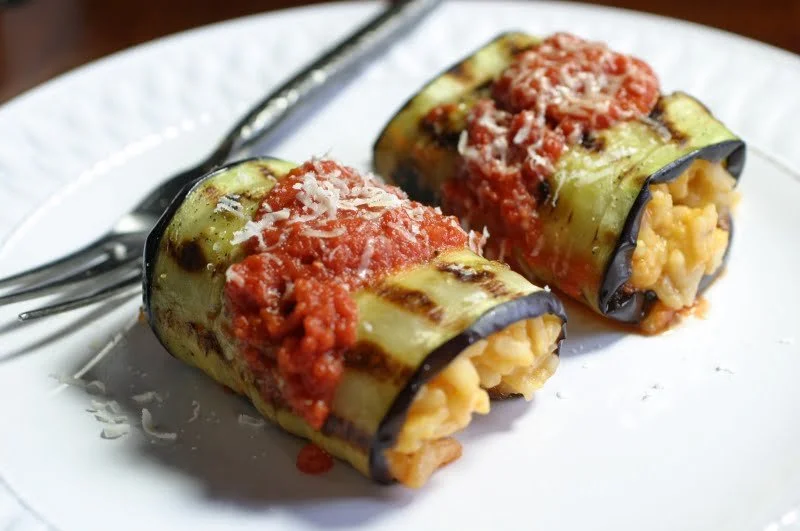Place a little marinara sauce in the bottom of a small baking dish. Place some risotto all along the eggplant slices and roll up and place seam side down in baking dish. Top with marinara sauce. Bake at 350 degrees for 20 minutes covered. Remove cover and bake an additional 10 minutes. Serve with grated parmesan cheese.