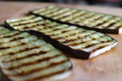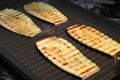 Heat a grill or grill pan on the stove. Make sure it's hot before beginning. Brush the eggplant slices on both sides with olive oil and sprinkle with salt and pepper. Grill on both sides until you have nice grill marks and the eggplant is pliable.