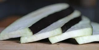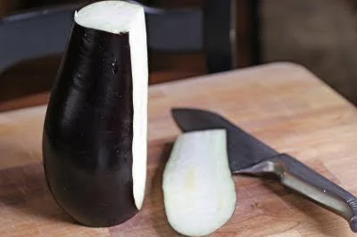 Slice the very ends off the eggplant. Slice the eggplant into 1/4 inch slices. You should have 5 slices for a large eggplant. Salt the slices heavily and place in a colander for about one hour. Rinse the salt off the eggplant and press with paper towels to dry.