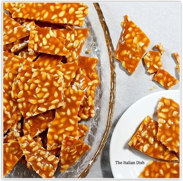 Do you need a good recipe this holiday season for a nice homemade gift? This Italian brittle is beautiful and delicious and a snap to make. Traditionally, it is made with almonds but this version is from Gina DePalma and has a little twist - she makes it with pine nuts. You can certainly make it with whatever nuts you like. I've made it with hazelnuts and that is nice, too. Gina also crumbles it up as uses it as a topping for cheesecakes at Babbo.