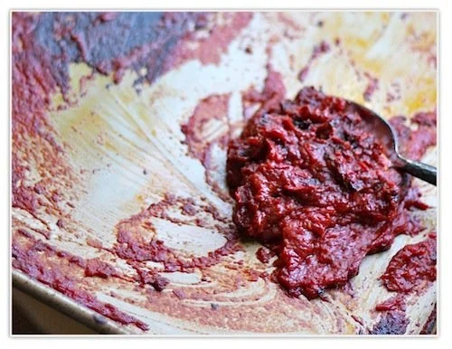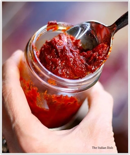 Since the Michigan sun is not comparable to the sun in Sicily, I made my tomato paste in the oven, replicating what the sun does - drying out the tomato puree slowly until the moisture was gone. The result is an incredible tomato product that you won't believe. In Sicily, they add a little of this to their soups, sauces or stews. You can even spread some on a piece of bread or crostini, if you like. It's so delicious you will be tempted to eat it with a spoon.