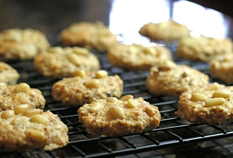 Line baking sheets with either Silpat or parchment. Form cookies into balls, about 2 teaspoons each. I use a melon baller and dip it in water when it gets sticky. Flatten cookies slightly. Brush with the last egg white and press a few pine nuts in the top for garnish.