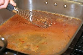 Take the meat out of the pan and place on cutting board. Put roaster on top of stove. You should have some very nice browned bits of meat - fond - on the bottom of the pan. Turn the stove to medium heat. Add the wine and, with a whisk, deglaze the pan. Add the broth and stir until you have a nice pan sauce.