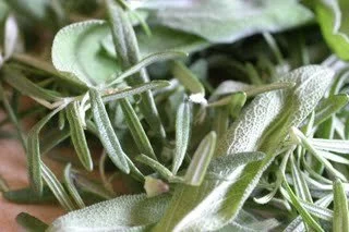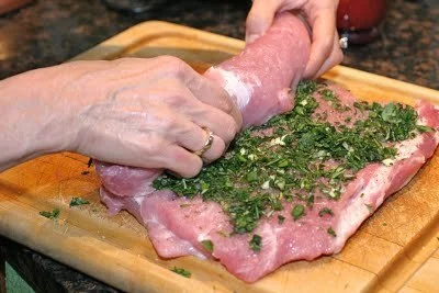 Strip herbs off their stems. Finely chop together with the garlic. Salt and pepper the meat. Spread the herbs on top of the meat.