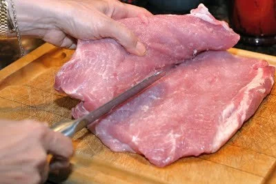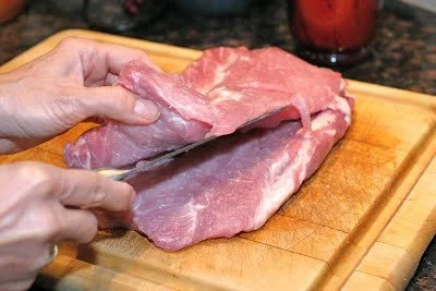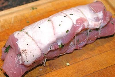 Butterfly pork loin, fat side down. Don't trim this outer layer of fat off - it will help keep the meat moist.