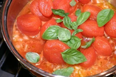 Wash the tomatoes and squeeze them to eliminate the seeds. Skip this step if using canned tomatoes. Put the tomatoes in a pot, with the oil, salt, some minced onions and some basil leaves and 1/3 cup of water (skip the water if using canned tomatoes).