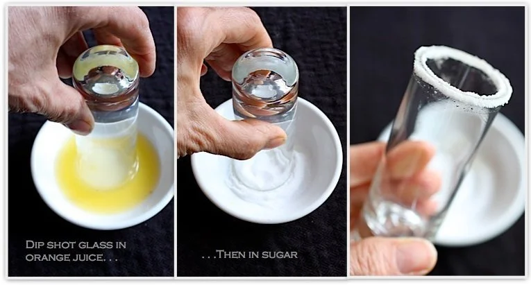 Place the orange juice and the sugar in two different shallow prep bowls. Dip the shot glasses first in the orange juice and then in the sugar.