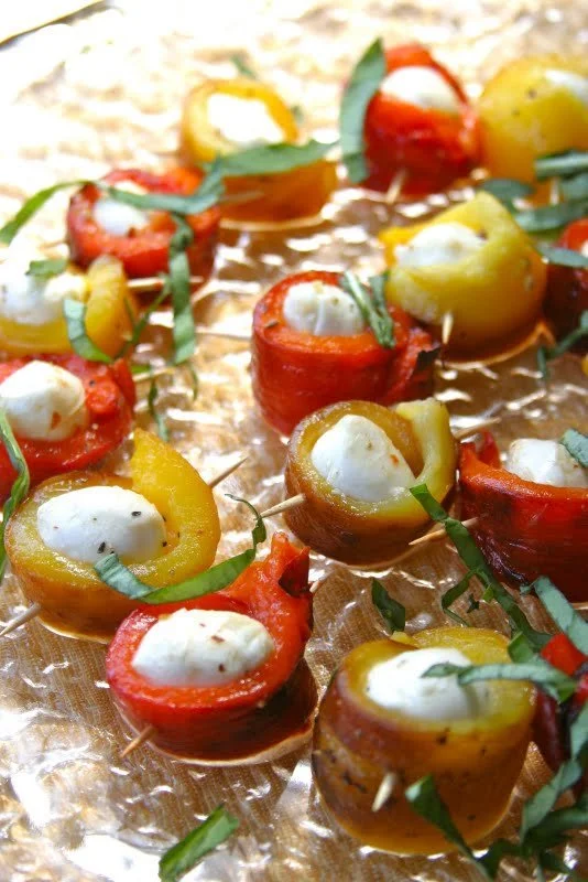 Boy, talk about an easy appetizer. How about using just two ingredients (three if you want to add the chopped basil) for a pretty, delicious dish of bite sized morsels? Roasting the peppers is an easy thing to do and if you've never done this yourself, start now. You will have another great technique in your cooking arsenal that will come in very handy. You can use this method to make Peperonata or to roast peppers for a sauce or side dish.